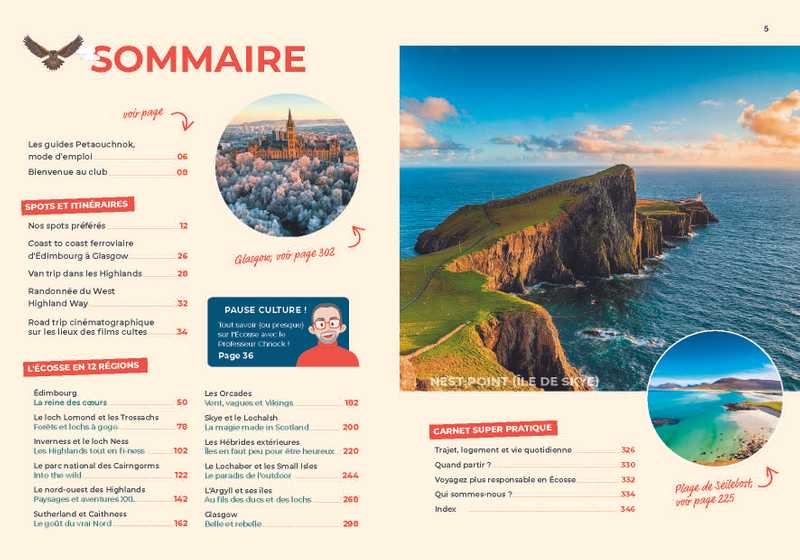 Avec votre guide Petaouchnok, vous allez pouvoir traverser l’Écosse en train, chasser les fantômes dans les manoirs d’Édimbourg, vous perdre dans les châteaux des Highlands, randonner sur des chemins au bout du monde, buller au creux des dunes de l’île de Harris, goûter le fameux « haggis »…