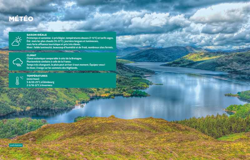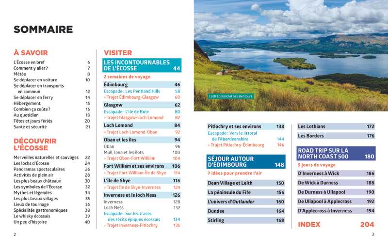 - Des pages thématiques très illustrées : lochs mystérieux, châteaux emblématiques, îles à la beauté brute, paysages époustouflants, distilleries…
