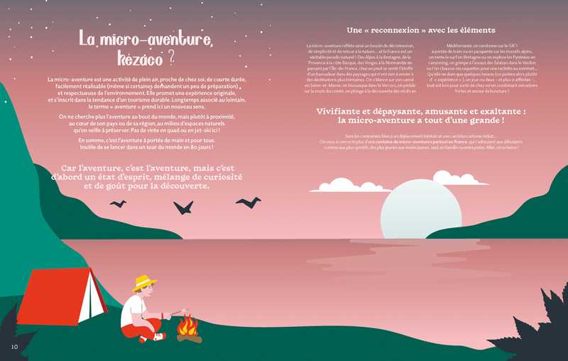 Dans cette nouvelle édition entièrement mise à jour, on vous prouve que l’aventure est au coin de la rue, et accessible à tous. Nul besoin de prendre l’avion et de traverser les frontières pour vivre une expérience intense et inoubliable. Et encore moins d’être un sportif de haut-niveau ! Ce livre va vous ouvrir de nouveaux horizons et vous reconnecter à la nature ! Nos auteurs ont sélectionné plus de 100 micro-aventures et expériences à réaliser sur une courte durée et près de chez soi.